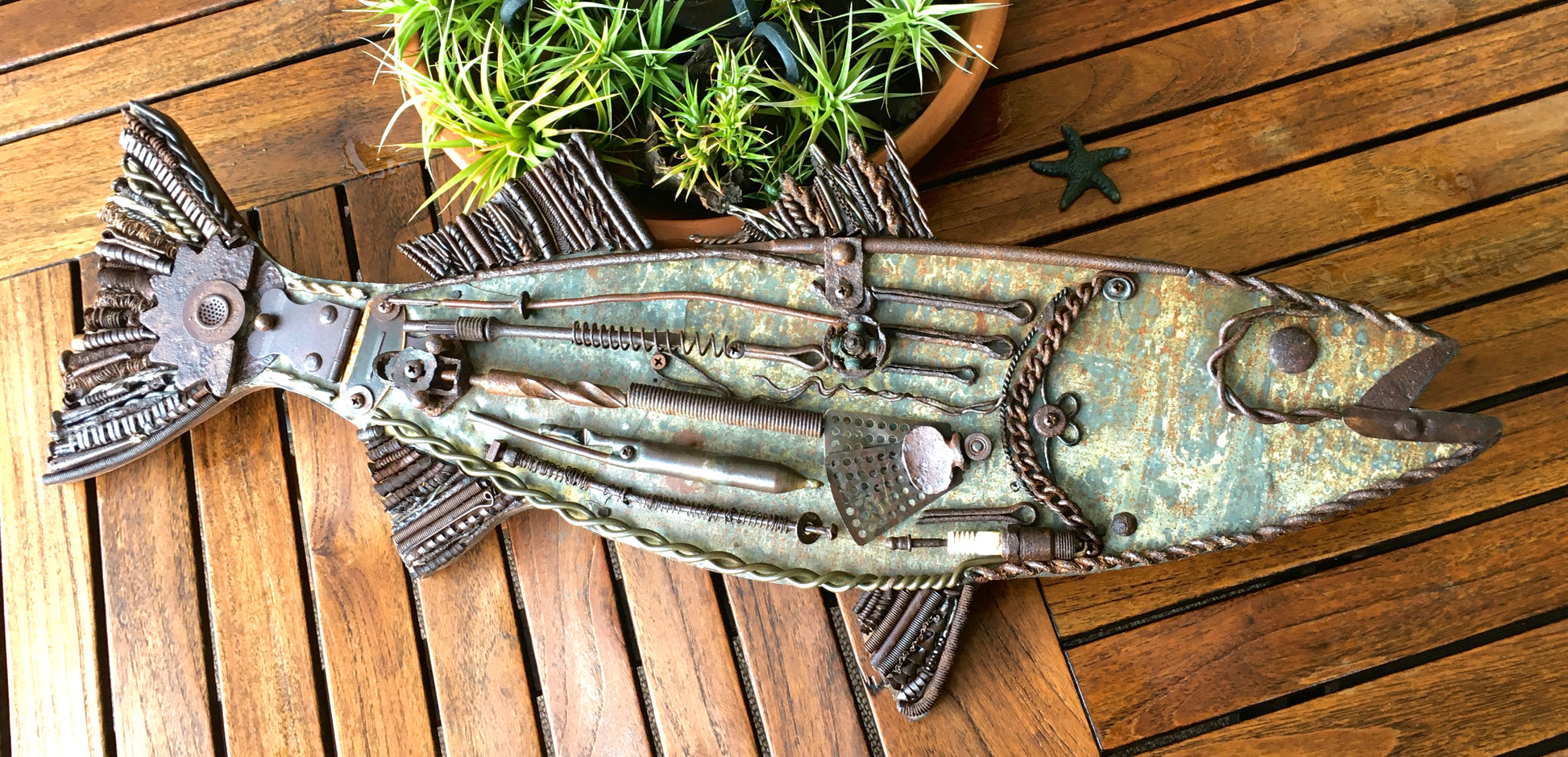 This exquisite sculpture captures the grace and beauty of the striped bass, meticulously crafted from reclaimed metal with a striking silvery finish. Each scale and fin is designed with precision, reflecting the natural elegance and dynamic spirit of this beloved fish. Perfect for both indoor and outdoor décor, this piece brings a touch of aquatic charm and rustic sophistication to any space.