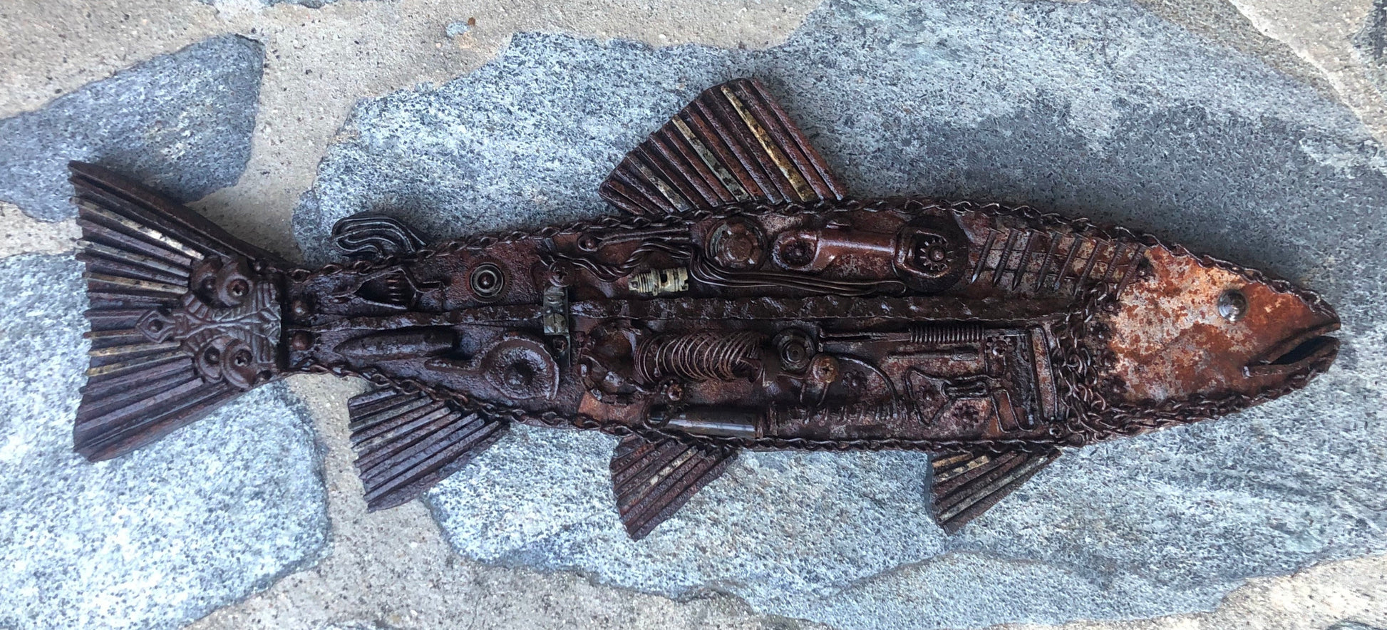 Crafted from reclaimed metal, this art piece embodies the rugged beauty and serene grace of a trout in its natural habitat. Each curve and detail of the fish is brought to life through meticulous craftsmanship, highlighting the rich, earthy tones of the rusted metal. Perfect for adding a touch of rustic elegance to any space, this piece is a celebration of nature's resilience and the artistry of transformation.